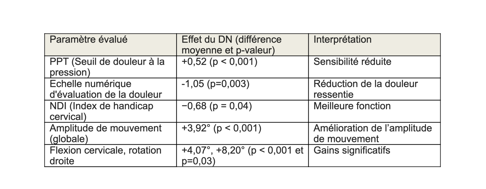 Les résultats montrent que le dry needling permet une amélioration significative à court terme de la douleur, du seuil de pression douloureuse et du niveau d’incapacité fonctionnelle, comparativement aux traitements témoins. En revanche, les effets sur l’amplitude des mouvements cervicaux apparaissent limités et généralement non significatifs. Ces données suggèrent que le dry needling constitue une option thérapeutique intéressante pour réduire la douleur et améliorer la fonction, mais qu’il ne peut être considéré comme une méthode suffisante à elle seule pour restaurer pleinement la mobilité du cou. La qualité méthodologique des études incluses reste toutefois hétérogène et parfois faible, ce qui limite la portée des conclusions. Des essais cliniques mieux conçus, avec des protocoles standardisés et un suivi à plus long terme, sont donc nécessaires afin de confirmer ces résultats et de mieux définir la place du dry needling dans la prise en charge globale des cervicalgies mécaniques