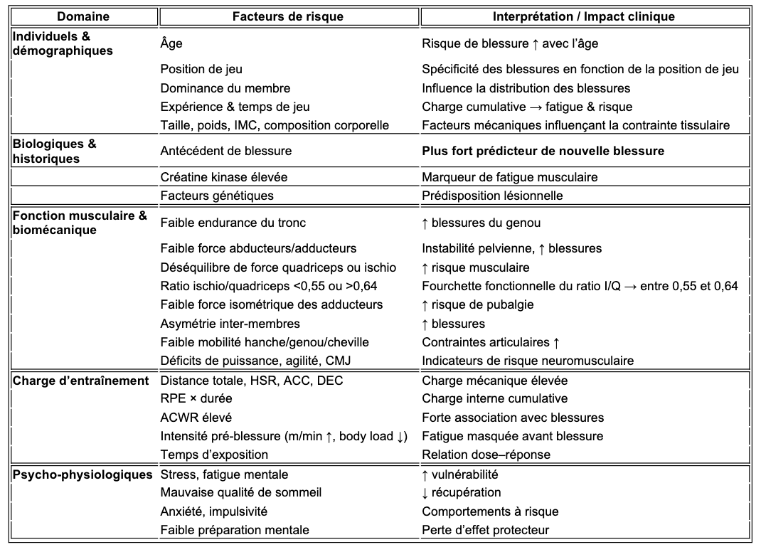 Cette revue systématique met en évidence la complexité de la prédiction du risque de blessure chez les footballeurs professionnels masculins. Les modèles étudiés reposent sur une grande variété de méthodes statistiques, allant des régressions classiques aux approches de machine learning, avec des performances prédictives très hétérogènes. Les blessures des membres inférieurs, en particulier musculaires, sont les plus étudiées, avec des facteurs de risque récurrents tels que l’âge, l’historique de blessure, la position de jeu, la charge d’entraînement, les paramètres neuromusculaires et certains facteurs psychologiques. Toutefois, aucun modèle isolé ne permet une prédiction fiable et généralisable. Ces résultats soulignent la nécessité d’approches multifactorielles, individualisées et intégrées, combinant données physiques, physiologiques, psychologiques et de charge, afin d’améliorer la prévention des blessures en football professionnel.